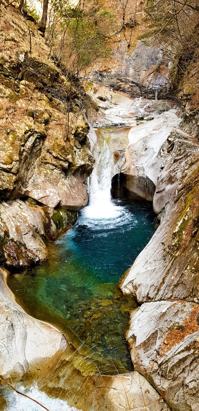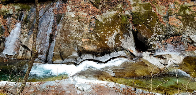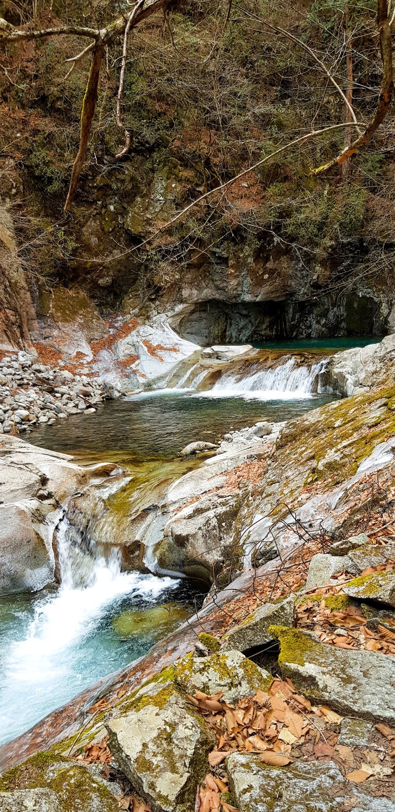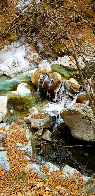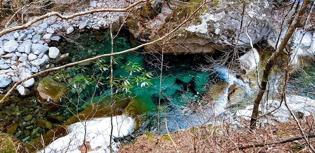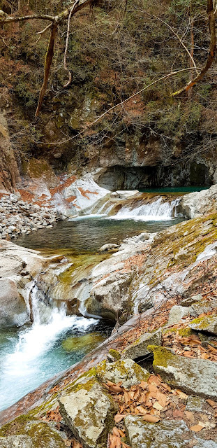 Fâché de ne pas avoir eu mon onsen la veille, je me suis mis en quête d'une rivière. Je crois que je vais pouvoir appeler mon road trip l'eau et les temples, parce que je fais que ça ! Mais cette gorge là valait vraiment le coup d'oeil. Pourtant, je n'étais pas chaud chaud à l'entrée. Bâtiments délabrés, 2 voitures sur le parking immense, une route dans la forêt pour accéder au site... Rien de laisser présager de l'endroit sublime que j'allais voir. Ultime bicoque abandonnée, et la route se fait chemin de terre, et la rivière chante en contrebas. Voilà qui est déjà mieux. Des passerelles elles aussi pas en forme me font douter. Mais que continue, on verra bien. Et bim, la rivière se rétrécie, le courant accélère, les merveilles apparaissent. La couleur de l'eau, la glace qui se forme à la limite du courant, l'ambiance est sublime. Il faudra se méfier toutefois, la glace est sur le chemin par endroit, ce qui rend l'aventure intéressante, mais j'ai le pied montagnard, et j'avance tranquillement. Connu comme les sept bassins du paradis, ce lieu n'a pas usurpé son identité. Après une ultime ascension sur des marches recouvertes de glace, j'arrive au 7eme paradis, et le spectacle vaut tous les P***** que j'ai lâché en cours de route. Je croiserais en tout 5 personnes. Pas de doute, on est bien samedi au Japon !