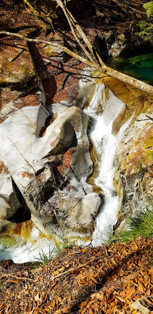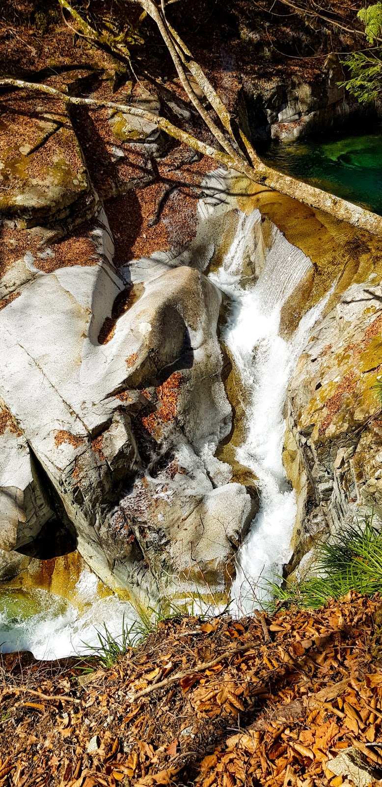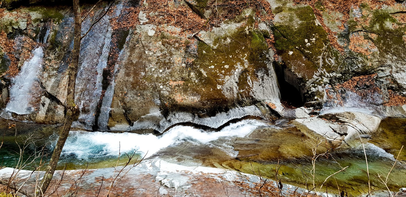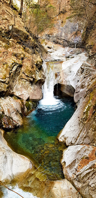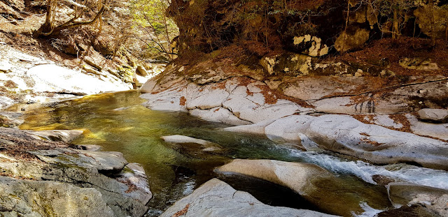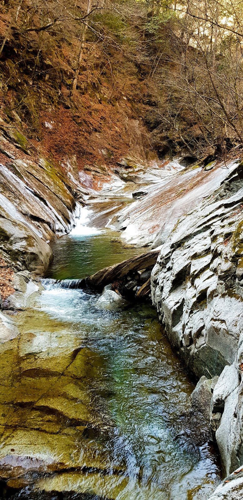 Fâché de ne pas avoir eu mon onsen la veille, je me suis mis en quête d'une rivière. Je crois que je vais pouvoir appeler mon road trip l'eau et les temples, parce que je fais que ça ! Mais cette gorge là valait vraiment le coup d'oeil. Pourtant, je n'étais pas chaud chaud à l'entrée. Bâtiments délabrés, 2 voitures sur le parking immense, une route dans la forêt pour accéder au site... Rien de laisser présager de l'endroit sublime que j'allais voir. Ultime bicoque abandonnée, et la route se fait chemin de terre, et la rivière chante en contrebas. Voilà qui est déjà mieux. Des passerelles elles aussi pas en forme me font douter. Mais que continue, on verra bien. Et bim, la rivière se rétrécie, le courant accélère, les merveilles apparaissent. La couleur de l'eau, la glace qui se forme à la limite du courant, l'ambiance est sublime. Il faudra se méfier toutefois, la glace est sur le chemin par endroit, ce qui rend l'aventure intéressante, mais j'ai le pied montagnard, et j'avance tranquillement. Connu comme les sept bassins du paradis, ce lieu n'a pas usurpé son identité. Après une ultime ascension sur des marches recouvertes de glace, j'arrive au 7eme paradis, et le spectacle vaut tous les P***** que j'ai lâché en cours de route. Je croiserais en tout 5 personnes. Pas de doute, on est bien samedi au Japon !