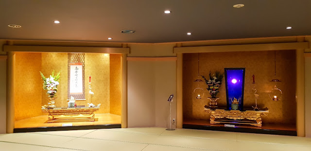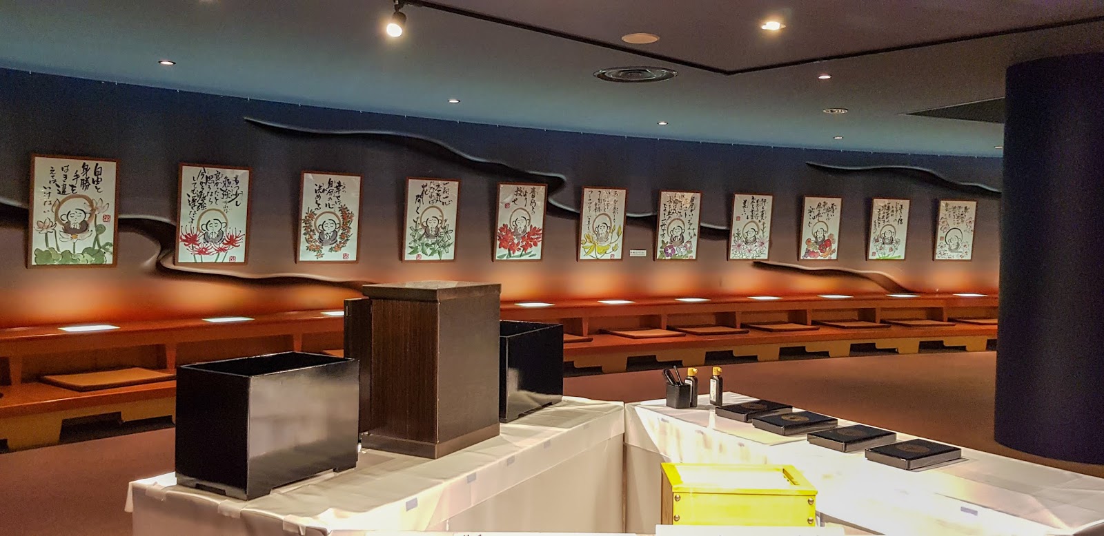 Ma partie préférée est juste ensuite. La salle de Shakyoo, la copie des sutras, et ici chacun à son petit tableau pour se concentrer. C'est toujours un bon moment pour moi. Fut un temps, on ne pouvait pas obtenir de calligraphie sans avoir copié un sutra. J'imagine des pèlerins en voiture qui doivent avoir mal aux mains rien que d'y penser.