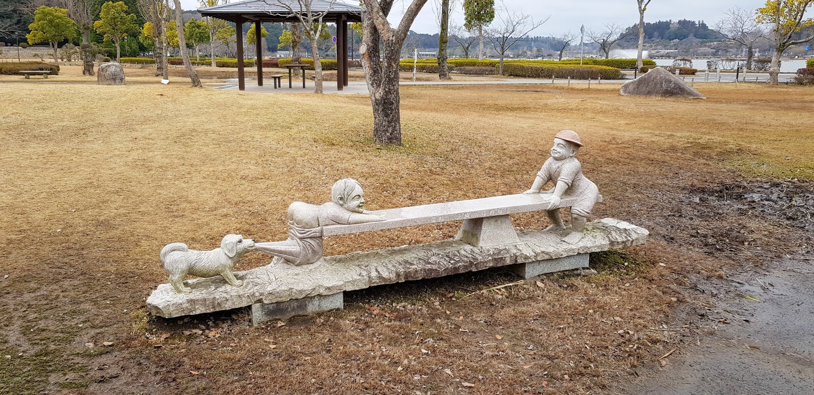 Un peu de mal à trouver le parking de la où je voulais aller ensuite puisque le GPS voulait me jeter dans le lac. Tourner à droite ! On va être mouillé à droite copine ! En plus de parler anglais et de vouloir me noyer, elle parle en miles et en pied. Je vais lui faire voir du pays moi, à la dame. Heureusement que je suis tout relaxé. Nouvel objectif, un parc parmi les plus beaux du Japon (je crois que tous les jardins, ruisseaux, châteaux, temples sont les plus beaux, vieux, grands, sacrés, ... ) Mais c'était un vrai coup de coeur. Et ça commence par une ambiance particulière ^^