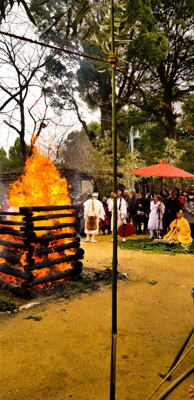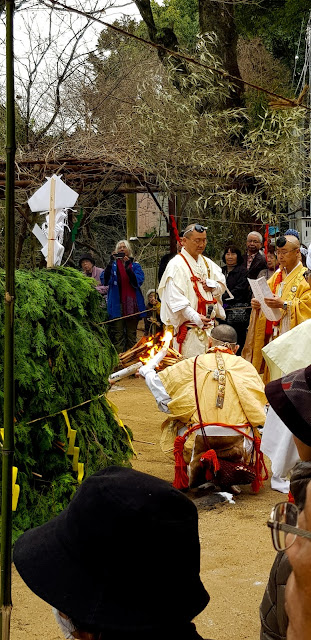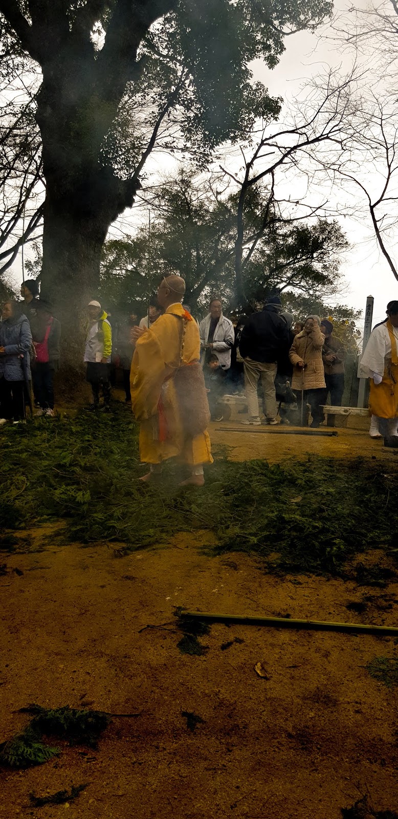 Pour le nouvel an, rendez-vous 23h devant la cloche. On accueille les gens avec des gateaux de pate de riz (mochi) dans un bouillon d azuki (haricot sucré) puis les gens sonnent la cloche sanctifiée pour l occasion par fuku djushoku en personne. A minuit, cérémonie au temple. Fuku avait son coin pour un goma, ceremonie du feu. Kuma etait au taiko, et elle avait mal au bras parce qu elle a tapé un bon moment. Et jushoku gérait la ceremonie a l autel. Une image qui m'a marqué, c est que le temple était plein, et que les 4 volontaires (3 actuels + 1 ancien ) n avaient pas de place. Je me suis placé sur le bord gauche du temple, dans un petit couloir intérieur qui fait le tour de l espace sacré, par terre. Mes acolytes ont suivis le mouvement. Nous voir tous les quatre en tailleur prier hors de la foule m'a touché. A un moment, jushoku s est levé avec un grand livre dans les mains. J etais a une extrémité, alors il a commencé par moi. Il m a dit de saluer, donc de baisser la tête, et BAM ! un gros coup de livre dans le dos. Les 3 autres ont eu le meme coup que moi, sponsorisé par les ostéopathes, mais les enfants et les vieux avaient la version soft. Et puis on s en est allé manger les restes, et se coucher, bien que personne ne se faisait d illusion. Les 4 heures de sommeil, meme sanctifiées, allaient faire mal.