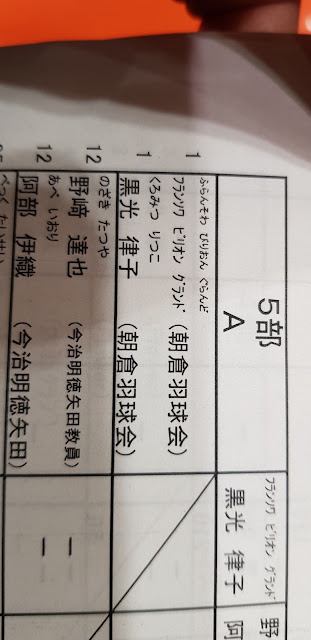 J ai aussi participé à un tournoi de badminton. Avec ma prof. Énorme gymnase, nombreux participants. Tout le monde convoqué a la meme heure, 8h30, pour un discours solennel. Puis on attaque le premier match avec une surprise, nous sommes en double mixte et on joue contre un double homme ! Voila pourquoi les filles envoient le steak ! Des scenes irreelles de petites gamines de 10 ans face a des gars baraqués qui crient a chaque smash. Quand on a terminé le match, les perdants sont juges arbitres du prochain match, les gagnants juges de ligne. On a fait une finale, donc 6 victoires et une défaite. Bon bilan. Je vous laisse me chercher dans le tableau !