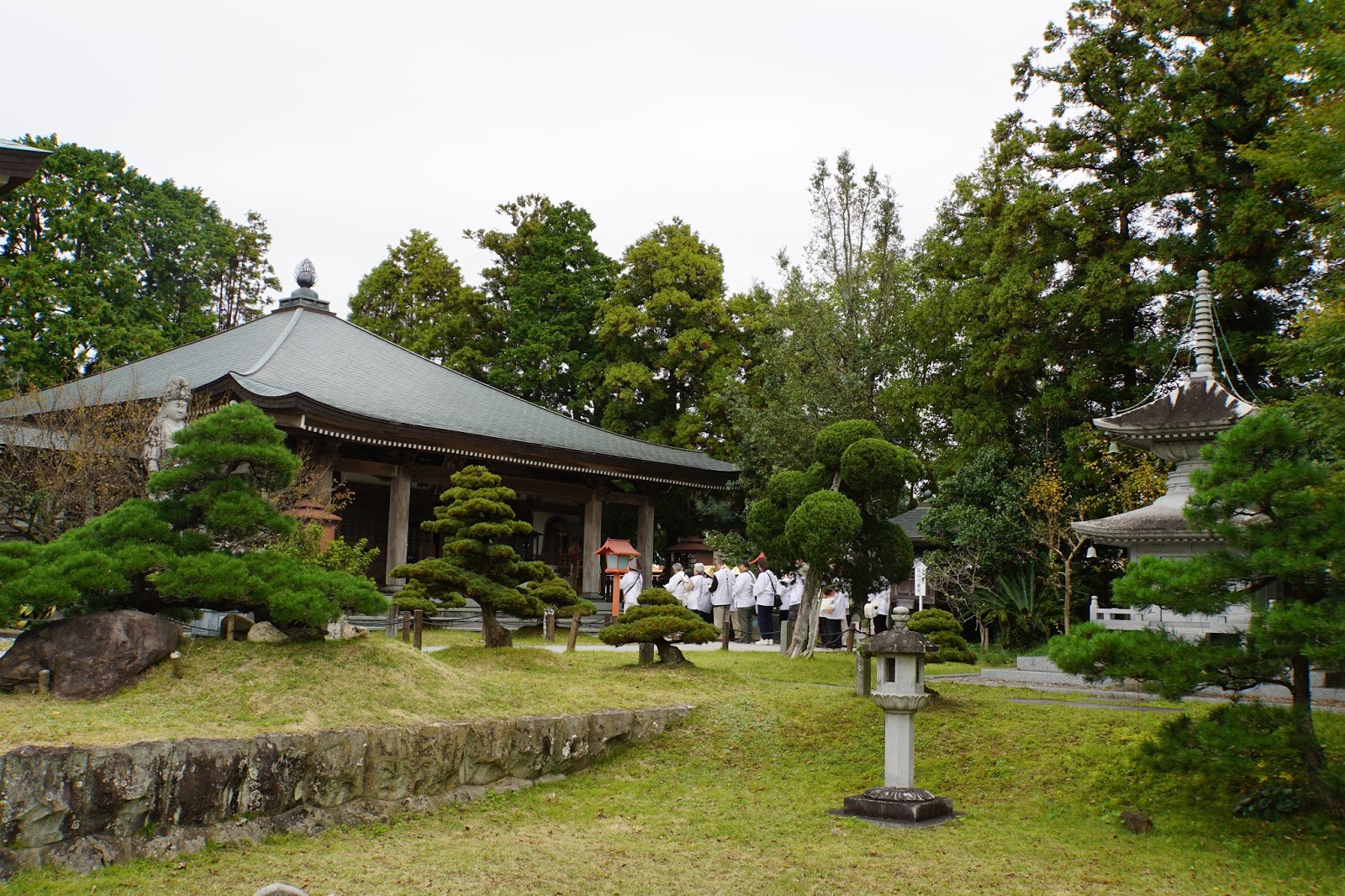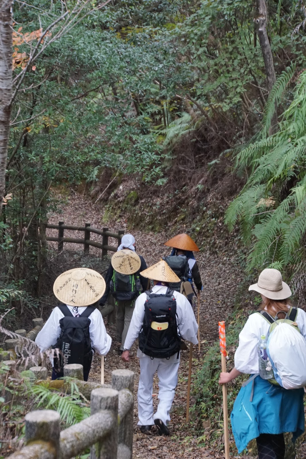 La nuit était trop courte je pense, mais il faut bien se décider à se lever. On a acheté le petit déjeuner dans un magasin pour le manger sur la route. Pas de chance, aucun banc, pas une hutte, rien pour se poser au calme et apprécier un bon repas. Une heure après, on s’est arrêté sur un escalier, perdu au milieu des montagnes. Puis, rapidement, on s’est attaqué à une belle pente, 400 m de dénivelé, pour trouver un sommet anciennement sacré, aujourd’hui abandonné. C’est là que nous avons trouvé 3 autres henros, rencontrés rapidement la veille. C’est ainsi que nous avons formé une drôle de communauté de henros, bigarrée et joyeuse, pour atteindre le temple 40, quelques 19 km plus loin. Les pauses sont plus longues, tout le monde parle japonais donc je me retrouve finalement seul, mais cela me va. C’est sympathique comme tout. J’arrive à caler des blagues sur les 7 samouraïs et à faire rire tout le monde avec mon imitation de guerrier au katana meurtrier.