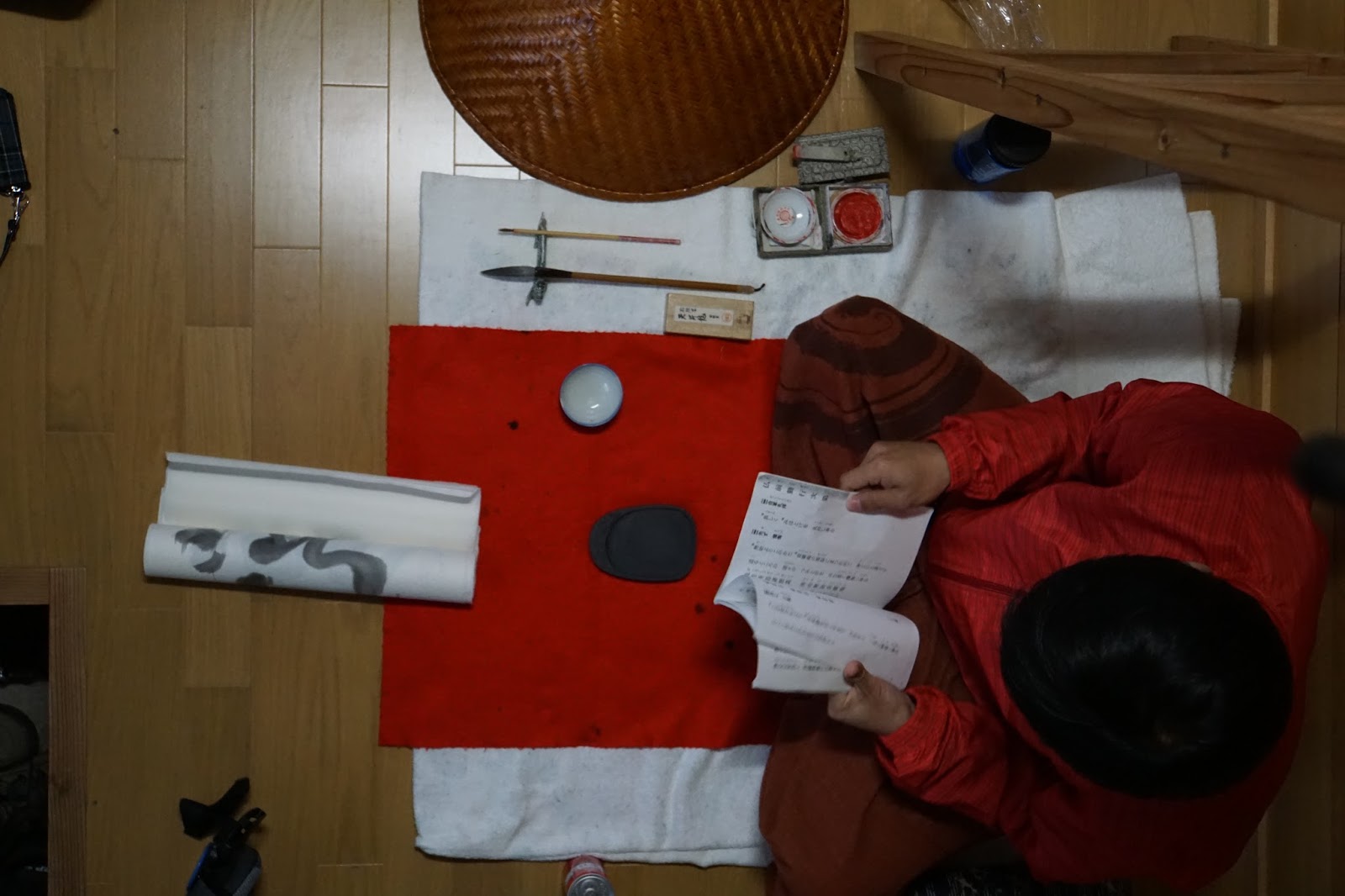 De retour à la cabane, on trouve un jeune tokyoïte qui est en mode barbare, avec des journées entre 40 et 50 km de marche. On l’invite à nous rejoindre, il accepte volontiers. Le jap de manga est aussi un bon calligraphe, et il nous a fait une demonstration. J’avais une belle vue depuis mon perchoir pour apprécier le spectacle. Ca prend pas mal de temps pour faire une petite chose, mais il faut voir la préparation et les rituels qui vont avant et après la peinture proprement dite. Comme souvent au japon, tout est codifié.