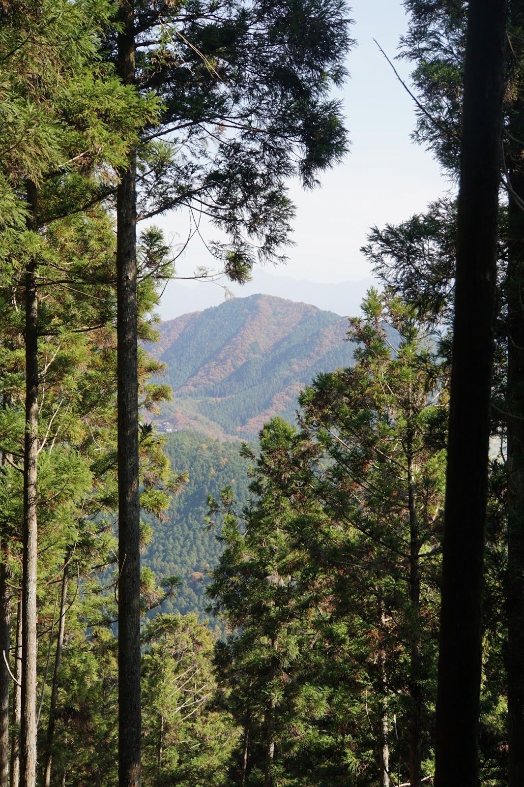 La première montée est tranquille, le soleil joue un peu, encore, à me faire des coups de chaud et des coups de froids. Mais, pour toute la journée je le sais déjà, mon cœur est en fête. Des montagnes, des petits villages pittoresques, des couleurs à ne plus savoir comment les décrire, du feu, des explosions, des grandes bandes de couleurs qui parcourent les monts et tracent ici des lignes, là des tâches jaunes, oranges, rouges. Je sais que j’ai le temps. Je sais que je peux m’arrêter pour profiter pleinement de ces paysages, de m’en enivrer si le cœur m’en dit. Je ne me prive pas. C’est un réel plaisir des sens. Vous marchez sur des aiguilles de pin fraichement tombées, et des feuilles multicolores. Il ne fait ni trop chaud, ni trop froid. L’air embaume l’essence de pin. Les oiseaux chantent leurs odes à l’automne. J’en viens à me demander si les jours de ville ne sont pas fait que dans le seul but de nous faire apprécier ces moments de paix. Bien sur, vous ne trouvez pas beaucoup de personnes pour vous offrir des choses, mais quand la nature fait osetai, vous n’en avez pas beaucoup besoin.