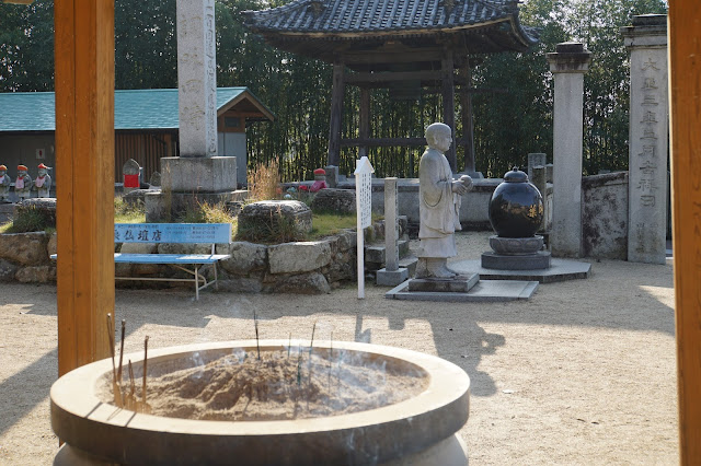 Le bangai 11 est l’opposé du 10. Facile à trouver, tout petit, personne. Mais personne. L’histoire voulait que Kobo Daishi aurait trouvé un grand magnolia de plusieurs siècle et aurait gravé une figure divine pour guérir les gens du choléra. Seulement voilà, le magnolia il est mort. Donc plus personne ne vient ici, sauf les 3 pèlerins qui font les bangais. Quand vous sonnez pour la calligraphie, le type il vient du bâtiment d’en face, pour vous dire s'il a souvent de la visite.