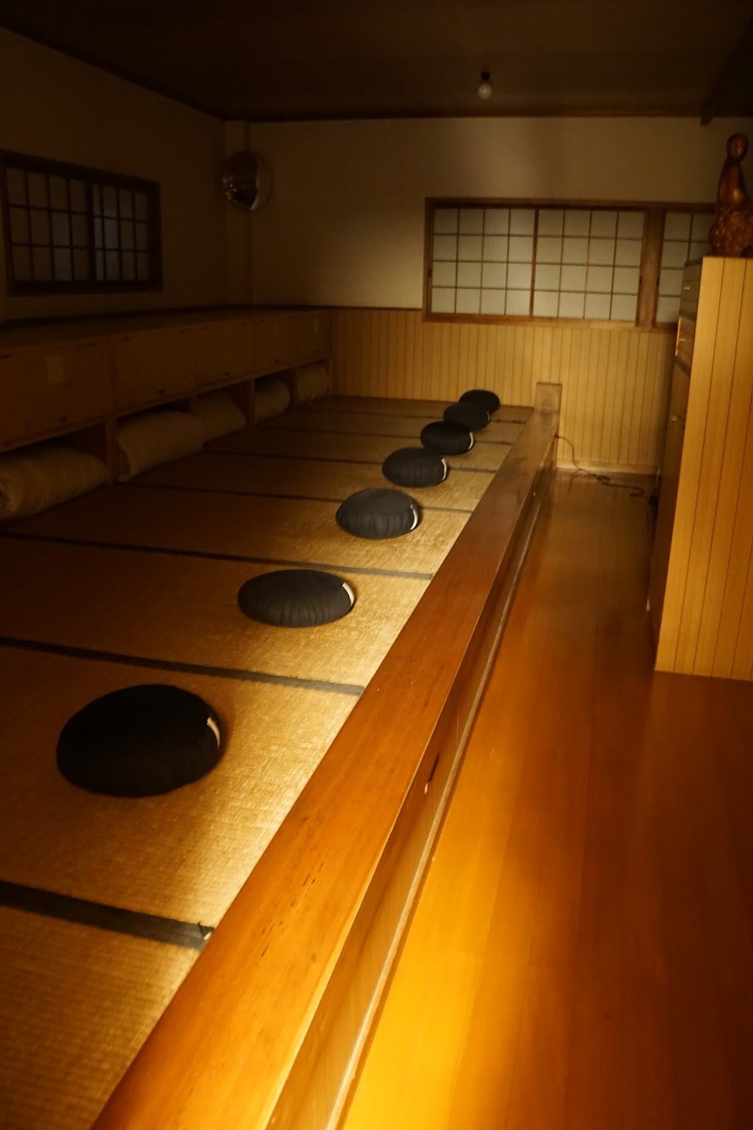 On s’incline devant la statue avec une autre position, Gassho, mains jointes, au niveau du nez à dix centimètres de ce dernier (précis). Puis on marche en Shashu en partant du pied droit, et on ne passe pas devant la statue, mais derrière. On arrive à son siège, on s’incline en Gassho devant, on se retourne et on s’incline à nouveau (pour dire salut les copains devant et derrière). Puis on s'assoit sur le petit coussin, on se retourne en se servant de la main droite uniquement, et on se met en position. Autant vous dire, j’ai pris une petite couverture pour mettre sur mes genoux, pas tant pour le froid que pour cacher la misère. Impossible de faire quoique ce soit de potable avec mes jambes. Un bon vieux tailleur, bien païen. Les mains en Cosmic Mudra (main droite palme en haut, main gauche dessus, les pouces qui se touchent), le dos bien droit, les yeux mi-clos, le regard à 45 degrés (fan de Kaamelott, à vous) qui se pose à un mètre de soi. Et en avant, au son de la cloche, 30 minutes de … rien. C’est très étrange, mis à part le fait que le corps hurle devant tant de torture (les muscles se plaignent quand ils bougent, et quand ils ne bougent pas, jamais contents), c’est l’esprit qui étonne. Tout d’abord, il se focalise sur des tas de choses, les bruits, les odeurs, l’expérience, puis il se fatigue. Progressivement, les pensées s’espacent, s'essoufflent, puis disparaissent, enfin. Le calme parfait. Le temps passe prodigieusement vite.