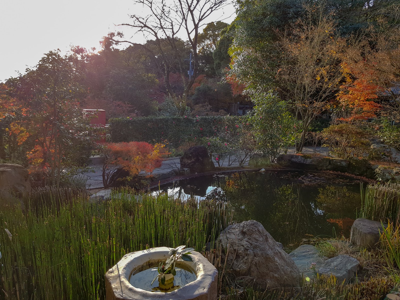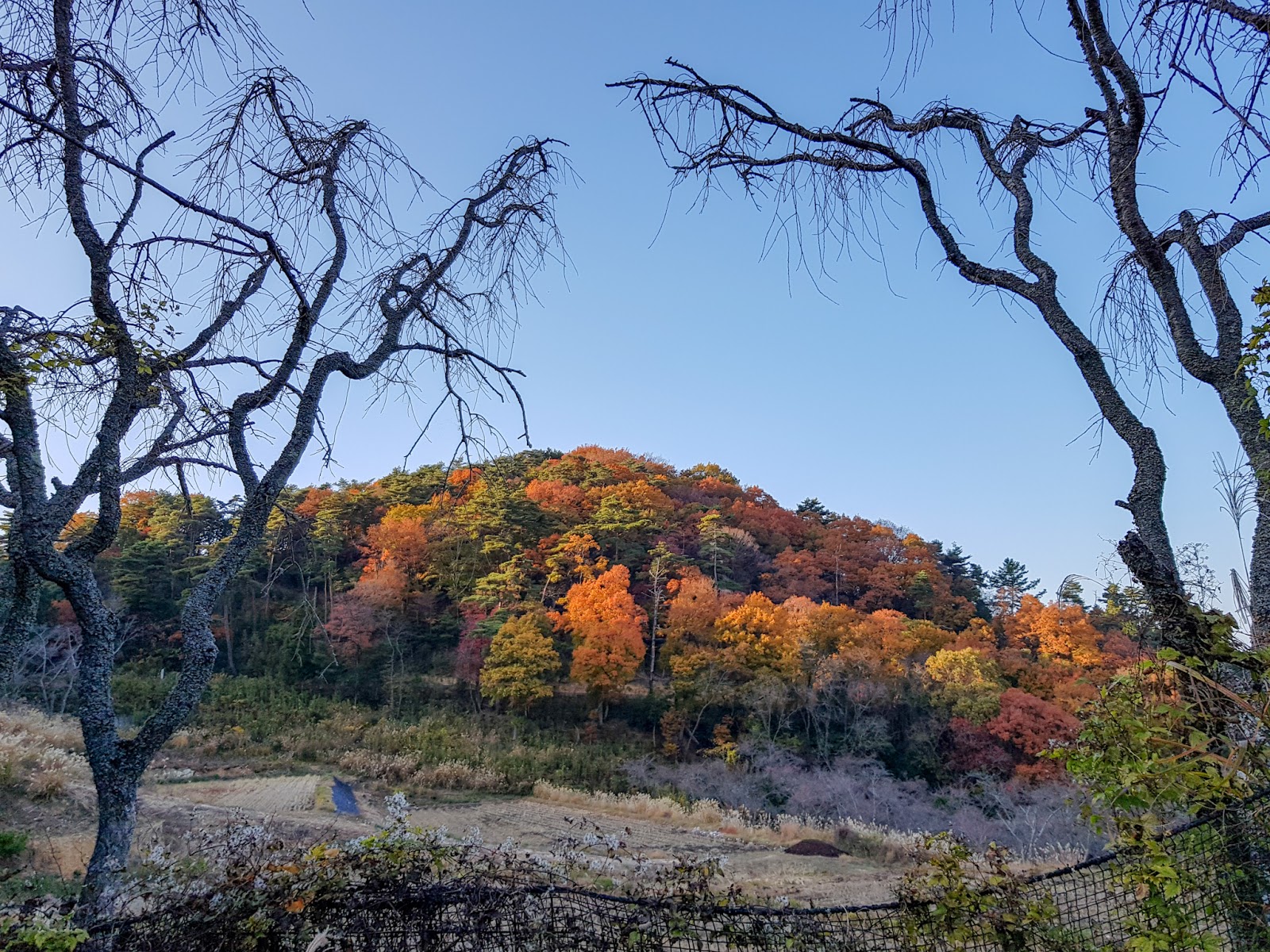 Et Fanfou dans tout ça ? Et bien il est volontaire. Volontaire au Japon, c’est assez simple. On se lève à 5h15 pour être à 5h30 au balayage du temple. Toutes les feuilles doivent être ramassées, partout sur le sol sacré du temple. À 6h, on va prier avec les clients et les henros, puis on retourne finir le balayage (on est en automne…) avant le petit déjeuner. On le prend autour de la table de la cuisine, ensemble. Puis les tâches sont diverses. On change les pneus des voitures, on nettoie le dojo de karaté, on pose de la paille de riz (wara) autour des mandariniers et des thés, on protége les rizières avec des grandes baches que l’on plante dans les talus, on récupère des trapes à sanglier pour les renforcer avec des barres en fer, … Il y a une pause onigiri à 11h30, puis on reprend le boulot jusqu’à 16h30 en gros. On discute pas mal avec Zachai San, sur le henro, le Japon, la spiritualité, nos parcours, nos visions de la vie, … et ça fait rire les japonais qui ne parlent pratiquement pas quand ils bossent. On est de retour au temple juste après 17h, alors qu’il ferme. L’absence de public nous permet de nettoyer les wc, les bougeoires et les vasques à encens, et de balayer les abords des temples pour qu’ils passent la nuit sans les feuilles de la journée. Une douche vers les 18h, le repas après les clients, la vaisselle et au lit !