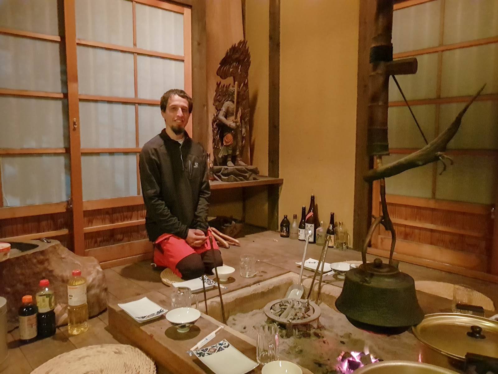 Ce Jushoku San est difficile à décrire. On ne rencontre pas souvent d’êtres de cette stature dans sa vie. Je pourrais vous décrire la dernière journée passée avec lui. La veille au soir, on avait improvisé une fête, car ils ont tué un sanglier. Nous sommes allés dans le pavillon construit par le Jushoku en personne, une ode à la vie de ses ancêtres les samurais, avec un four creusé dans le sol autour duquel on s’asseoit par terre. Sur des charbons de bambous mijote un bouillon de sanglier avec des légumes du jardin. En plus de la bière, on avait droit à un Bordeau supérieur et du fromage (je crois qu’il m’aimait beaucoup), quelques poissons et des boulettes de pate de riz en dessert. cette soirée était comme un rêve pour moi. J’étais dans un film, mieux, dans une histoire que je m’étais créé. Tout le monde parlait japonais, ce que je ne comprenais pas, Zachai me le traduisait rapidement. On pouvait quitter la table pour plonger dans le onsen avec vue sur Imabari et ses lumières artificielles. On rajoutait des légumes dans le bouillon pour qu’il y en ai encore jusqu’à que tout le monde ait les baguettes posées sur le bol.