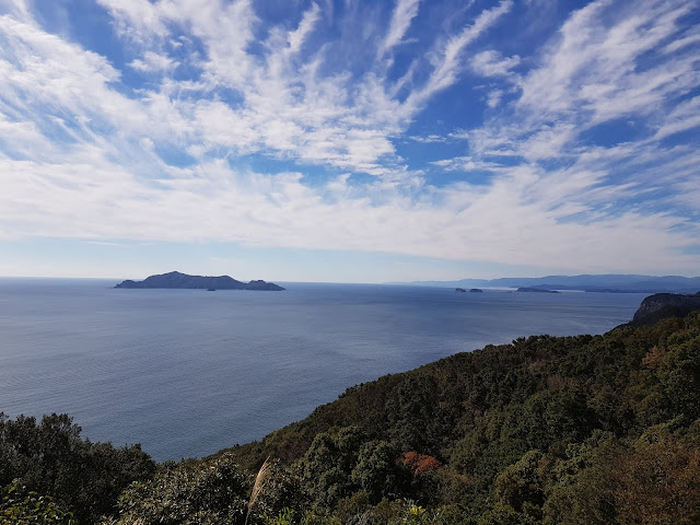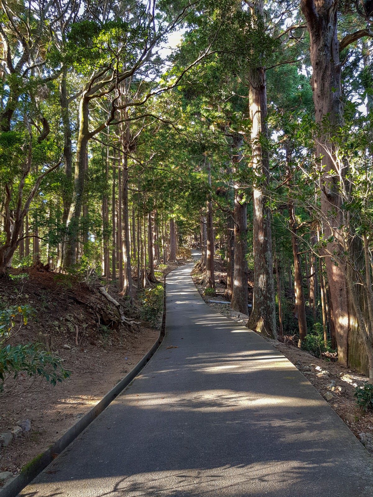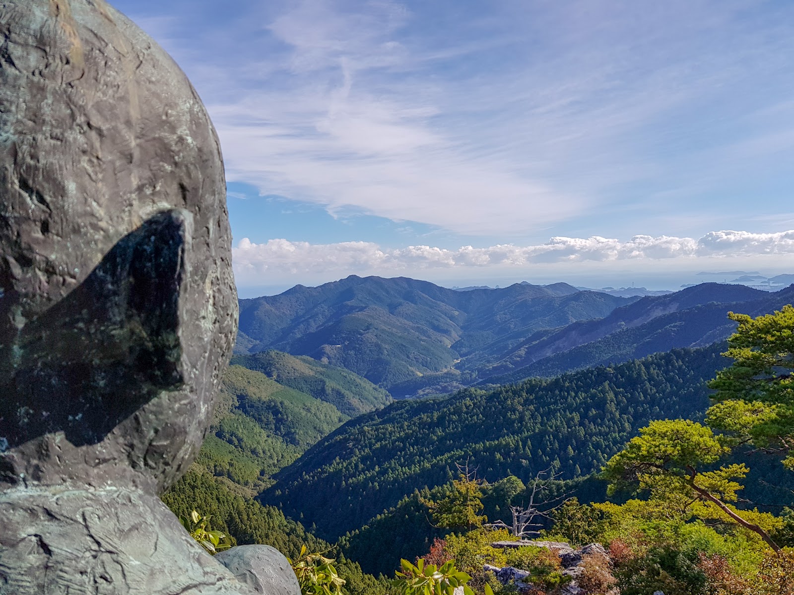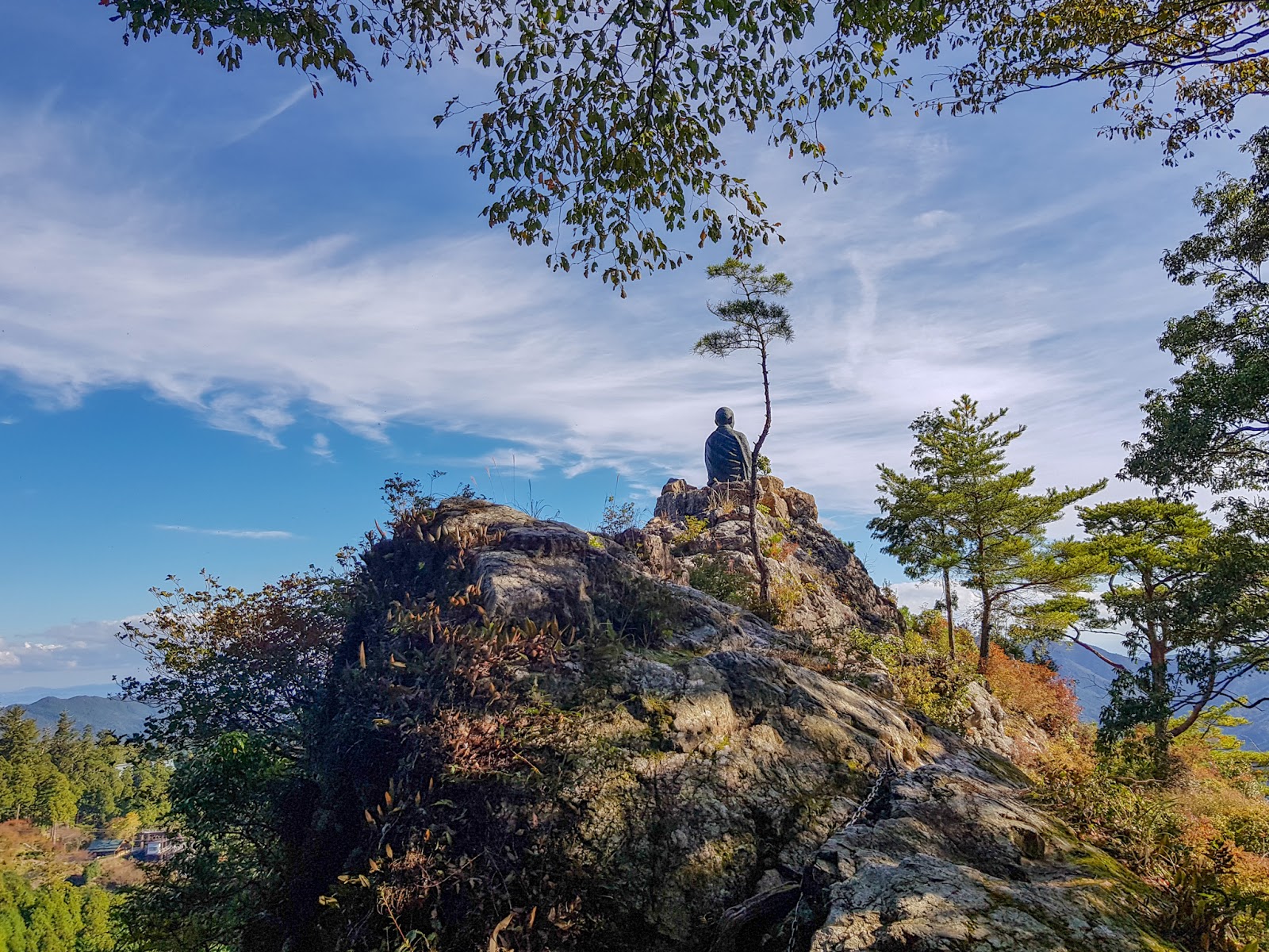 Je n’avais pas tellement le temps, mais je l’ai pris. J’emprunte la route ancienne pour redescendre de ce temple, car il passe par un endroit spécial. Après une petite montée entre les statues de divinités, on arrive à un petit temple. Et là, au sommet d’un rocher, un kukai assis en tailleur, en train de méditer. Et quand on se rapproche, on comprend pourquoi il a choisit cet endroit. La vue est tout simplement incroyable, avec les vallées, les sommets, la mer au loin, … Je me suis laissé allé à la méditation moi aussi, dans ce endroit mystique. Et puis le chemin m’appelle. Je retrouverais certainement Kukai à un moment.