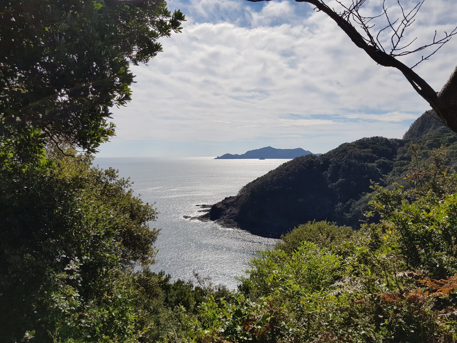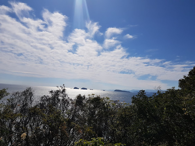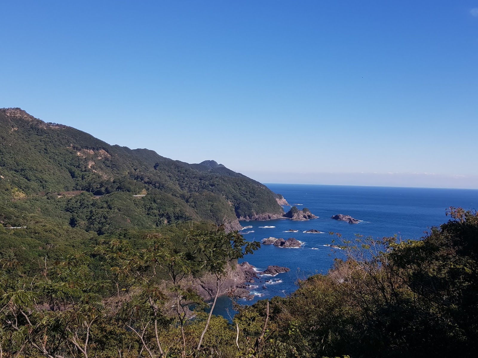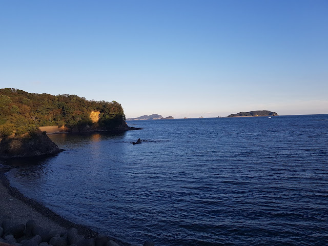 La marche qui s’en est suivie était plutôt intense, et pas très intéressante pour tout dire. Par exemple, sur un tronçon de 4 km, je n’ai pas croisé une voiture ! J’avais donné une dernière chance au temple 23 de nous recevoir les filles et moi. L’appel s’est plutôt mal passé, et s’est conclu sur un refus pour cause de trop plein. J’ai alors contacté une guest house recommandée par ahohi. Et plus rien n’était compliqué. On pouvait arriver à l’heure que l’on voulait, avec ou sans les filles, (3 filles pour vous, chanceux m’a t’elle dit dans un français parfait au téléphone) Oui parce c’est un couple franco japonais qui tient l’endroit. Je n’ai pas trop profité de la plage, j’ai filé pour faire ma calligraphie à temps. Je sais que la côte ne me quittera pas avant le temple 38, j’aurais le temps d’en profiter. Le temple 23 se dessinait au loin, un grand temple, tout étagé. Après mes prières, je suis allé au stupa en hauteur, d’abord pour le petit parcours dans le noir avec les prières en haut parleur, les calligraphies et les tableaux, puis pour la vue sur le port.