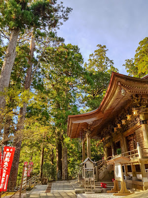 On prend une grosse pause proche d'un sanctuaire shinto, histoire de recharger les batteries et l'estomac, et on se remet en route. Saba Daishi, notre arrivée, n'est plus très loin. Je sentais déjà l’excitation monter en moi. La dernière fois, j'avais eu droit à une belle cérémonie, celle du feu (vous vous souvenez ?) et on m'a demandé d'y être avant 17h, pour prendre le repas. Il se trouve que si on mange aussi tôt, c'est pour que l'on puisse faire la cérémonie pas trop tard! Alors j’étais plein d'espoir.
