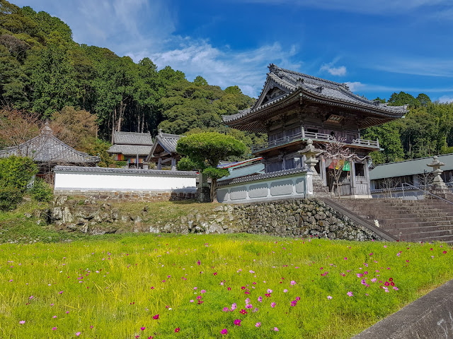 Le temple 22 arborait toujours fièrement les couleurs sacrées, qui étincellaient au soleil. En entrant, je me suis rendu compte de la présence de quelques lycéeens, intrigués par ce henro barbu. Le professeur attendait dans un coin du temple, l’arrivée d’autres groupes, qui ne manquaient pas de saluer le sensei bien bas quand ils arrivaient. Une sorte de jeu de piste, de ce que j’en ai vu. Alors que je récitais le sutra du coeur, j’ai pris conscience de la présence de nombreuses personnes sur des tables, en train de prendre un repas bien mérité. Ce sont les personnes qui jardinnent, élaguent, remettent des couleurs, les volontaires qui font que ces endroits sont aussi beaux, qui prennaient des forces avant de rattaquer le boulot. Avant de partir, un car de touristes rentrait dans le parking. Décidement bien chargé comme petit temple.