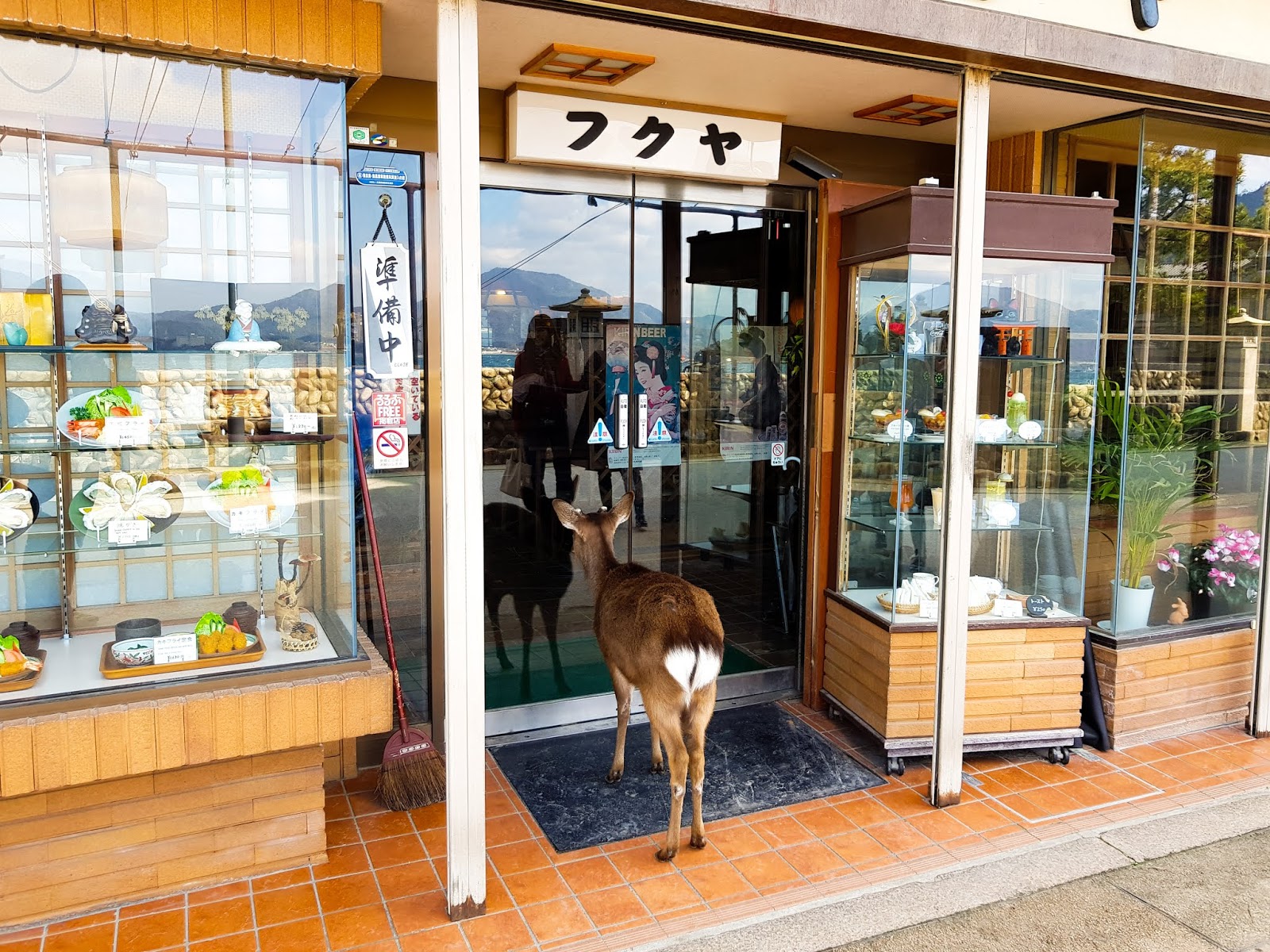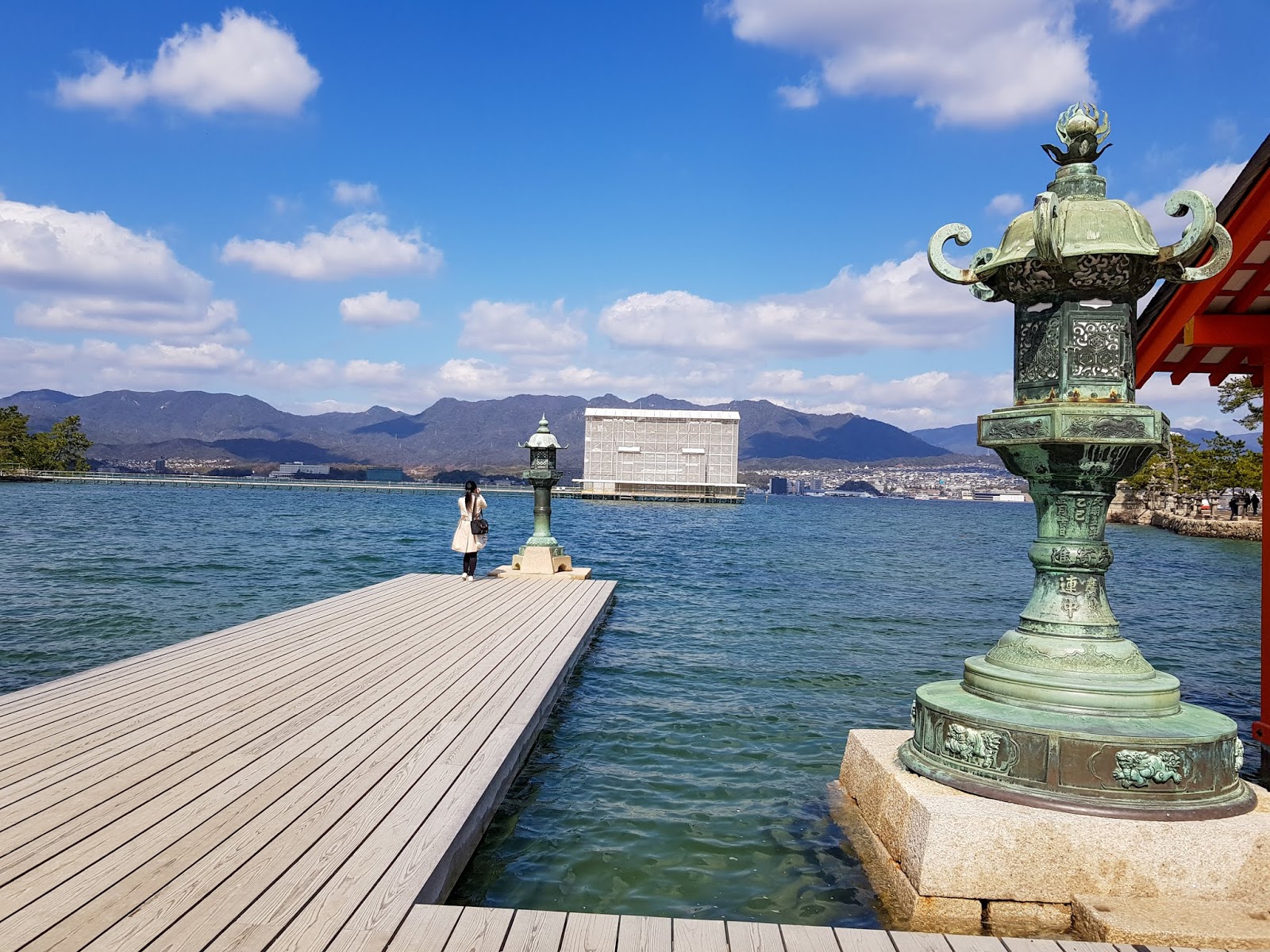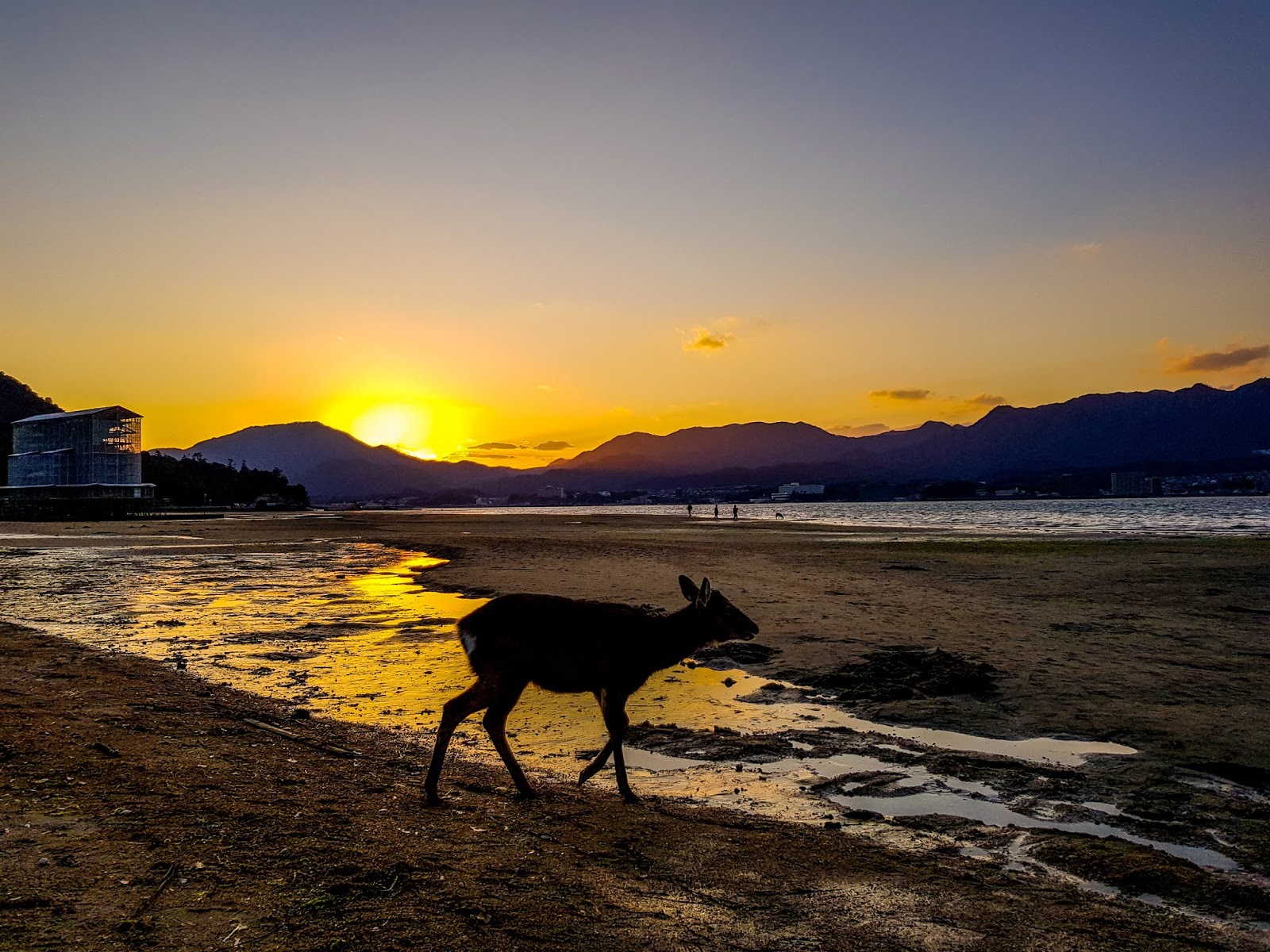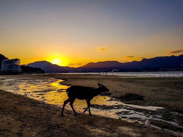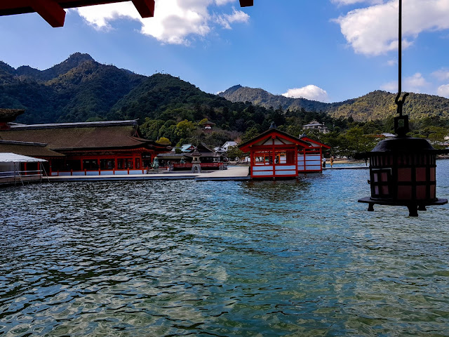 Mais revenons à nos moutons, enfin nos daims, dans le cas présent. Car oui, là où je vais, yen a aussi. Un petit ferry, depuis lequel on nous annonce que le torii (portail shinto) que l'on s'apprête à voir est mondialement connu, que cette vision ne nous quittera jamais, que le spectacle est superbe... On y reviendra... Car oui, ma destination c'est Miyajima, l'une des trois plus belle vue du Japon, quand le torii n'est pas en réparation, couvert de bâches ...